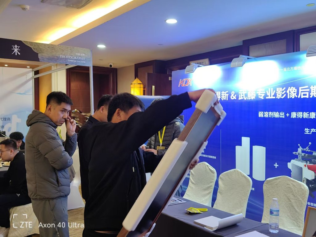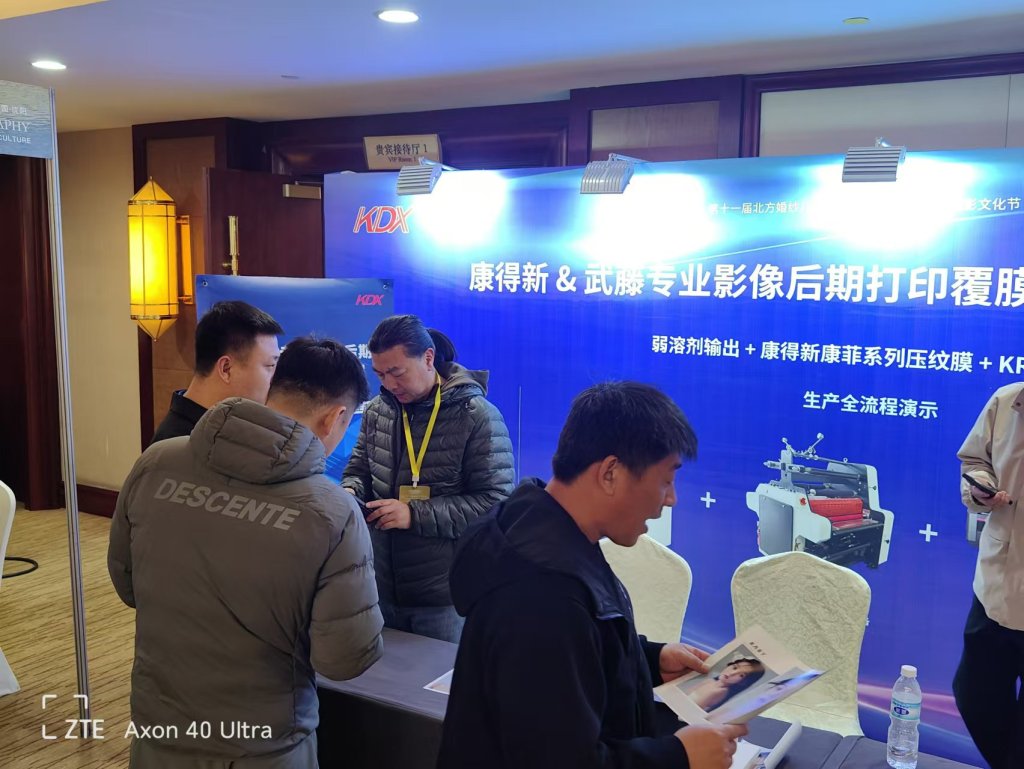 本次活动中,康得新重点推出了针对专业影像后期制作市场的成熟且稳定的整体覆膜压纹方案——康菲系列压纹膜 + KR-800卷对卷覆膜压纹机。该解决方案适配佳能、爱普生、武藤等多种数码打印设备,同时在影像效果输出上有着出色的表现,支持打印两种纹路:绸纹和细绒纹,高质量的视觉效果,吸引了大量与会嘉宾驻足观摩与深入咨询。