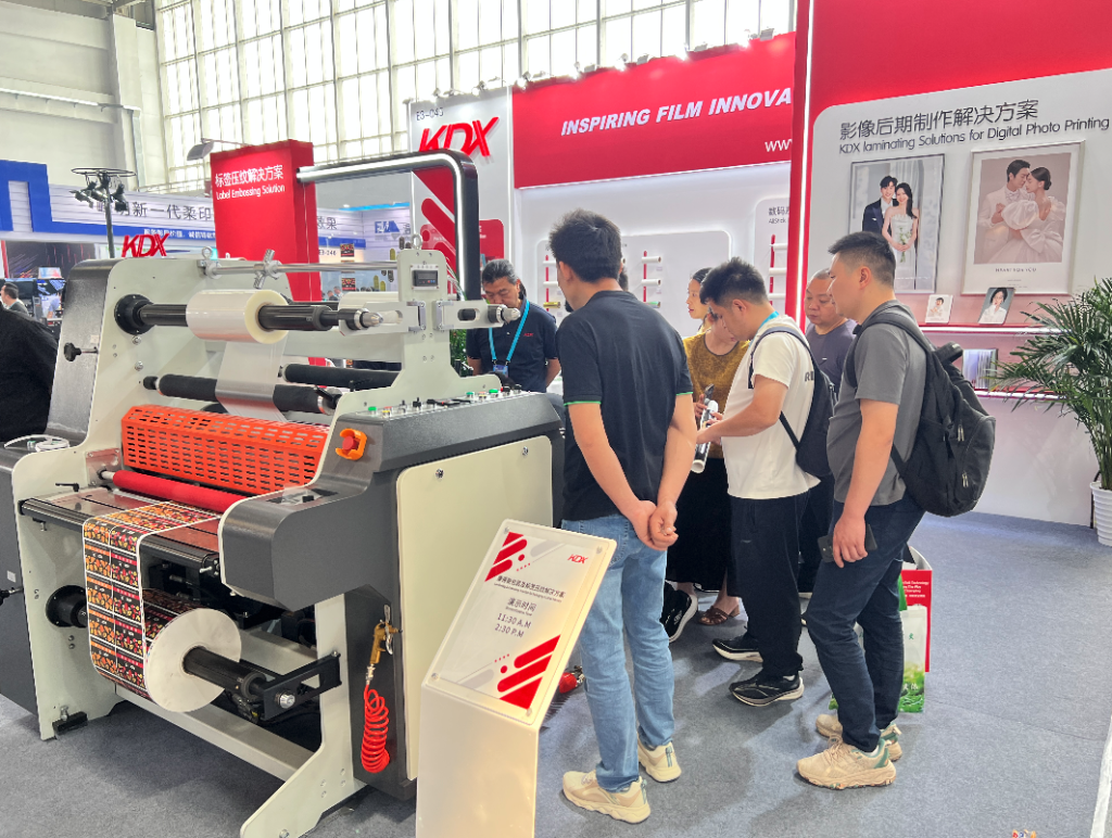 展位另一侧是标签压纹解决方案区,KR-800卷对卷覆膜压纹设备与配套产品以新颖的展现方式呈现在观众面前,该区域的透明玻璃上标签压纹成品呈K字黏贴到玻璃两侧,在灯光的照射下标签表面的磨砂纹、布纹清晰呈现,引来众多观众前来观看,一旁的标签样品自取区,观众可以自行拿取标签压纹的样品,为后续潜在销售做好铺垫。