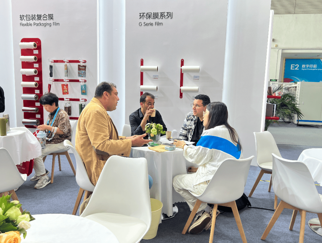 在展会期间,中国包装联合会塑包委副秘书长胡正阳、王晓梅等组成考察团莅临康得新展位进行深度考察,重点了解了软包装复合膜及包装压纹解决方案。考察团对康得新的最新方案及产品表示高度肯定,并期待康得新在推动行业技术升级与绿色包装发展中发挥更大作用。